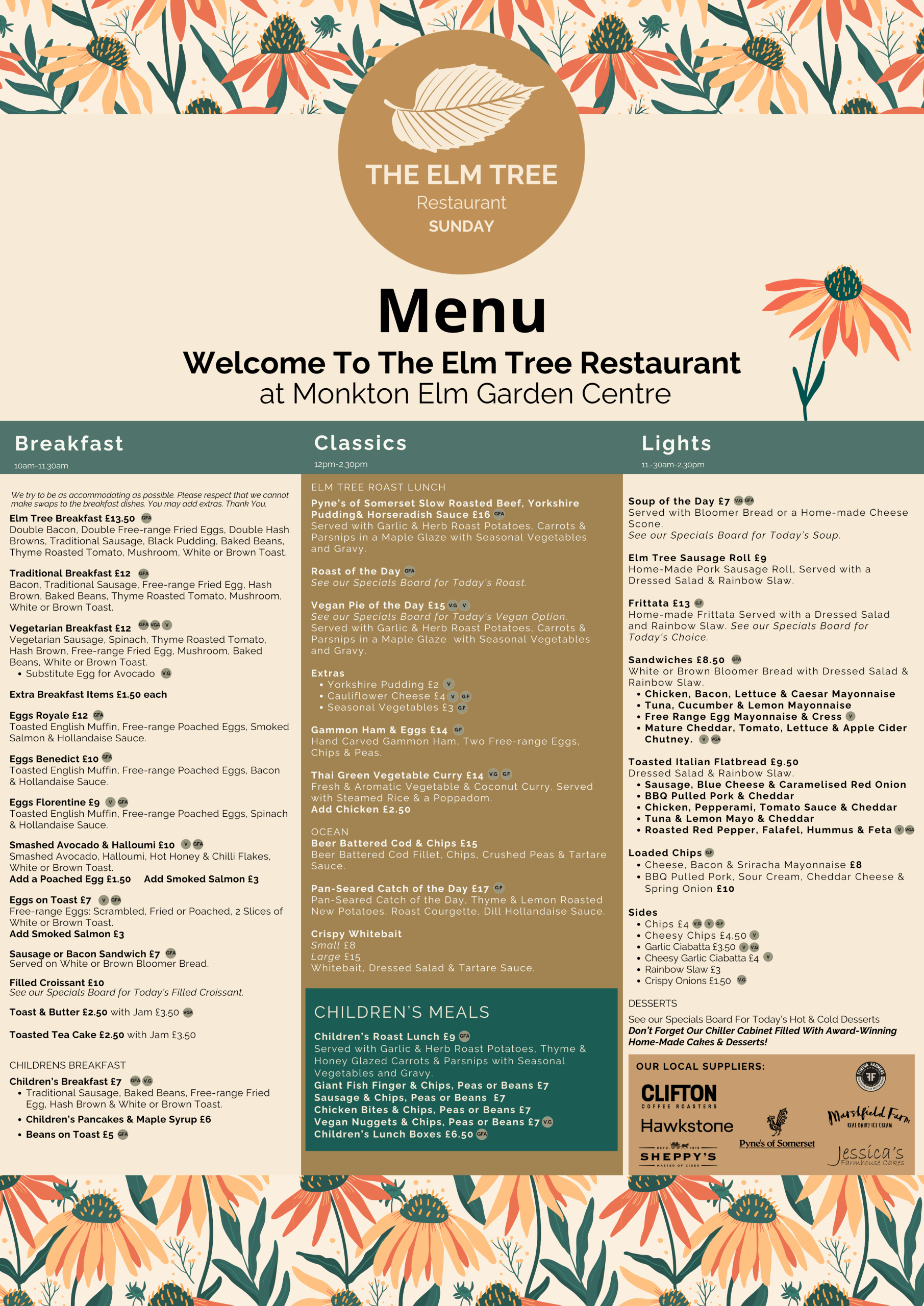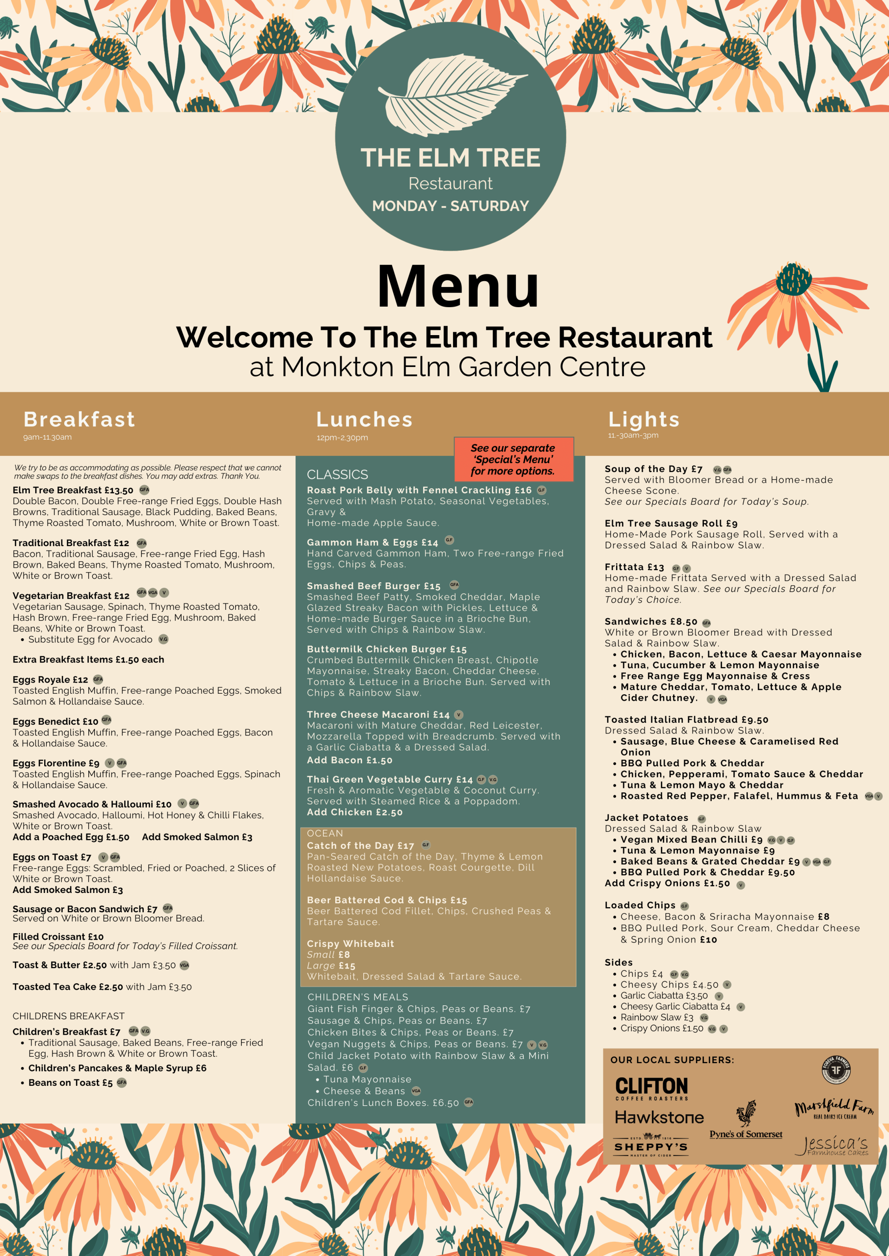 Only special assistance or guide dogs are permitted within the Elm Tree Restaurant. If you have come to the garden centre with your dog, you can still enjoy Hot Drinks and food in our Pondside Café.